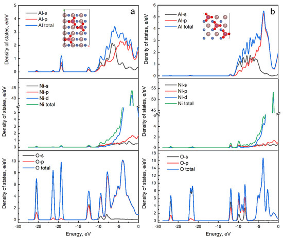 Figure 8 shows the partial density of states (PDOS) of Al, Ni and O atoms on the stripped (110) and (200) surfaces with three nitrate ions’ adsorption. It can be seen that all peaks of PDOS for O atoms overlap with those for Al and Ni atoms, indicating full hybridization among atomic orbits. The O-s electrons dominate in the energy range of −27.5 eV to 15 eV and bond with the s and p orbital electrons of metal elements. The O-p electrons bond with the s and p orbital electrons of metal elements in the energy range of −5 eV to the Fermi level. In addition, there are p-d bonding states between Al and Ni atoms occupied in the energy range of −15 eV to the Fermi level. The great difference in the bonding characteristics of different stripped surfaces results in the inhomogeneous stripping of the AlSiY coating. For the (110) surface, the O-s orbit at −19.2 eV hybridized with Al atoms is more obvious than that with Ni atoms. This indicates that the Al-O bonds are stronger than the Ni-O bonds, which corresponds to the calculated bond populations. However, for the (200) surface, the O-s orbit (−26.8 eV and −21.6 eV) hybridized with Al and Ni atoms is weak. The bond hybridization between the O-p orbit and Ni atoms dominates the bonds on the (200) surfaces. The weakened bonds contribute to the improved anti-corrosion property on the stripped surfaces, as well as the increased EWF.