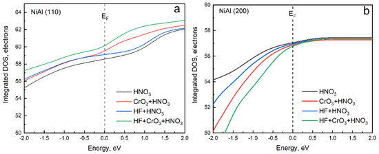 Integrated density of states of adsorbed O atoms on the (a) β-NiAl (110) and (b) β-NiAl (200) surfaces etched by different removal reagents. Only the O atoms in the NO3− are considered.