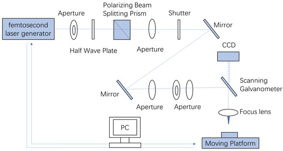 The schematic of the ultrafast laser processing used in this experiment is depicted in Figure 2. A commercially diode-pumped solid laser (PH1-20, Light Conversion, Vilnius, Lithuania) was used in this work, thus emitting pulse laser with a wavelength of 1030 nm, a pulse width of 290 fs, a maximum power of 20 W, and a repetition frequency of 100 kHz. During the machining process, the workpiece was securely fixed on a 5-axis machining platform via a fixture. The workpiece’s status was continuously monitored through a CCD camera. When workpiece penetration was detected, it indicated the completion of machining, and the process was stopped.