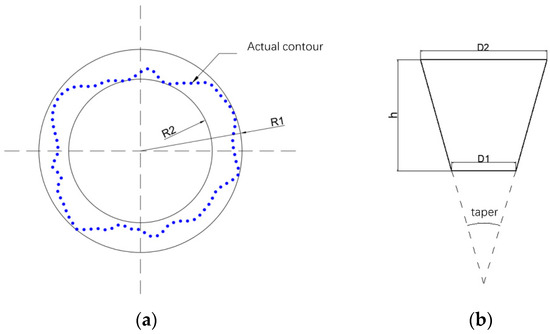 where represents the radius of the smallest externally tangent concentric circle, corresponds to the radius of the largest internally tangent concentric circle, and ∆r is the difference between these radii. A smaller roundness value indicates that the shape is closer to an ideal circle. The taper is defined as follows: