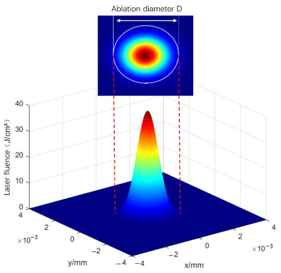 The femtosecond laser peak power and ablation radius are related to the mean laser power. The Gaussian distribution of a single-pulse laser is depicted in Figure 5. Notably, the further away from the center of the laser pulse was, the smaller the laser fluence became. The peak fluence, denoted as , can be expressed as a function of laser power: