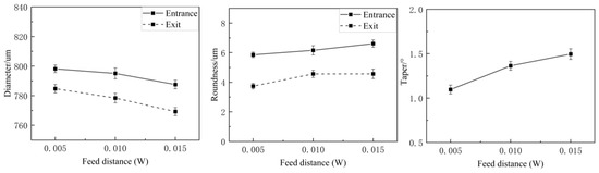 The impact of the feed distance on the geometric precision is presented in Figure 12. The results reveal that as the feed distance increased, the diameters of the microholes increased, while the taper angle and roundness values decreased. The surface morphologies of the microholes, observed through SEM, are displayed in Figure 13.