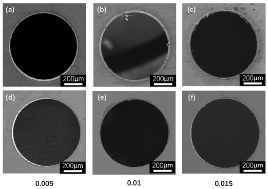 Cross-sections of the hole walls, observed via SEM, are depicted in Figure 14. At a feed rate of 0.015, the laser focus moved downward faster than it removed the material. The incompletely removed material hindered the downward movement of the laser energy, thereby decreasing the energy density in the lower hole. Simultaneously, it impeded the material from being expelled, thereby leading to incomplete ablation of the lower hole material and machining residue sticking to the hole wall (Figure 14d). Therefore, it is important not to select an excessively high feed rate during laser machining.