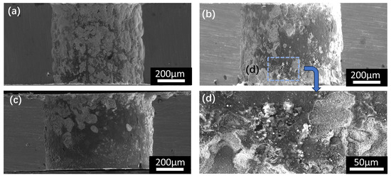 The surface morphologies of the microholes, observed through field emission scanning electron microscopy, are presented in Figure 6. Notably, defects were evident around the peripheries of the square holes when the mean laser power was 16 W (Figure 7). The process of material removal with a femtosecond laser involves the absorption of energy by electrons, which is then followed by energy transfer to the lattice. When the lattice temperature surpasses the metal’s melting point, thermal melting occurs. Due to the extremely short pulse widths of the femtosecond lasers, the electrons absorb a significant amount of laser energy in a short timeframe. This results in substantial lattice overheating, thereby leading to microstructural alteration explosion. As the mean laser power increased, the laser fluence also increased, thereby accelerating electron thermalization processes and increasing the percentage of microstructural alteration explosions in the material removal. The high-temperature and high-pressure vapor formed by the microstructural alteration explosions of the pore walls, with energetic particles exiting through the tops of the microholes, generated a secondary process affecting the upper holes, thereby ultimately compromising the integrity of the upper pore perimeters (Figure 7a,b). Additionally, the continuous downward movement of the laser processing plane caused some of the molten metal that burst through the lower holes to adhere to the undersides of the microholes (Figure 7c,d), thereby impacting the surface integrity of each microhole.