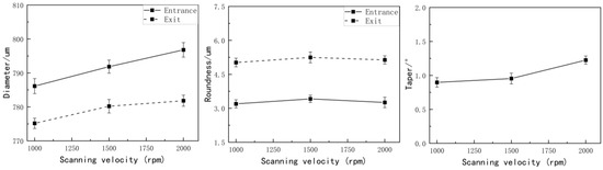 In laser drilling, the scanning velocity directly affects the spot overlap rate of the pulsed laser. As the scanning velocity increases, the laser spot overlap rate also increases, thereby resulting in a higher effective number of pulses per unit area of material removal. This enhances the efficiency of laser material removal. Zhao et al. demonstrated that the depth and width of laser-machined grooves no longer increased when the effective laser ablation number reached saturation [29]. It can be inferred that once the scanning velocity reaches a certain value, the laser’s efficiency in material removal saturates, and the aperture diameters of the microholes no longer increase. The effect of the scanning velocity on roundness is negligible. Therefore, as the scanning velocity continues to increase after reaching saturation, the roundness should decrease.