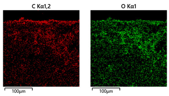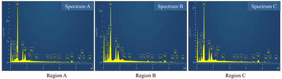 To better analyze the pore wall quality results of the microholes, the chemical compositions of the pore walls were analyzed using EDS. The cross-section of a microhole is shown in Figure 18, and the chemical compositions of region A, region B and region C are displayed in Figure 19 and Table 3, Table 4 and Table 5, respectively. In comparison to the composition of region C, regions A and B contained a significant amount of C and O elements in the EDS-layered images(Figure 20). Most of these elements were concentrated on the attachments on the inner walls of the microholes. This phenomenon may result from the instantaneous ionization of the bulk material during femtosecond laser processing, which reacts with an auxiliary gas to form oxides such as aluminum oxide, nickel oxide, chromium oxide, etc. [30,31,32]. These oxides subsequently reattach to the inner walls of the microholes, thereby forming a recast layer.