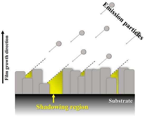 However, when the thin film is formed using magnetron sputtering, the shadowing effect can lead to crack formation, and Figure 1 shows a schematic diagram of the shadowing effect. During the film deposition, particles can approach the surface at typical angles and can be selectively accumulated by a higher surface area with a protuberance due to the shadowing effect. This effect leads to the formation of rougher surfaces and void boundaries with columnar structures [27,28]. This phenomenon finally results in crack formation and a reduction in the mechanical properties.