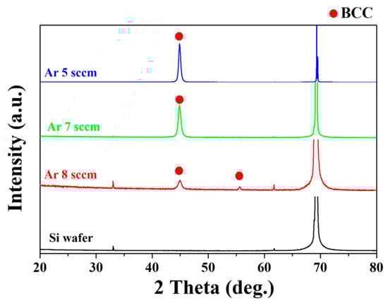 The XRD patterns of AlCoCrNi HEA metallic films deposited at various Ar gas flow rates are shown in Figure 2. Due to the thin deposition thickness, even the XRD pattern of the Si substrate was detected, and aside from the peak of the Si substrate, only the peak of the AlCoCrNi metallic film was exclusively analyzed. The XRD result confirmed that the phase of the AlCoCrNi HEA metallic films is the BCC phase. It appears that there is no phase transformation of the thin films according to the Ar gas flow control during the sputtering process. The grain size of the HEA metallic thin films was calculated from the Scherrer equation [36], using the dominant peak from the measured XRD in scans with a 2θ range of 20 to 80°. The calculated grain sizes are summarized in Table 2. This increase in the grain size with an Ar gas flow rate of 5 sccm is due to the decline in the collisional events during the travel of the particles from the target to the substrate. So, particles reach the substrate with promoted mobility caused by the long mean free path of sputtered atoms [22,38,39], resulting in a highly crystalline film. These results act as factors influencing mechanical properties.