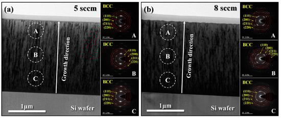 For detailed phase characterization, TEM SAED pattern analysis was conducted on AlCoCrNi HEA metallic films deposited at Ar gas flow rates of 5 sccm or 8 sccm. For both thin films, SAED pattern analysis was performed in three sections—top layer (A), middle layer (B), and bottom layer (C), respectively—as shown in Figure 3. As shown in Figure 3a, the SAED pattern analysis of regions A, B, and C revealed that the entire film was composed of the BCC phase (reference circle shown a = 2.88 Å) in reasonable agreement with XRD measurements. Therefore, it can be confirmed that the thin film achieved uniform growth, and the same result is seen in the case of Figure 3b.