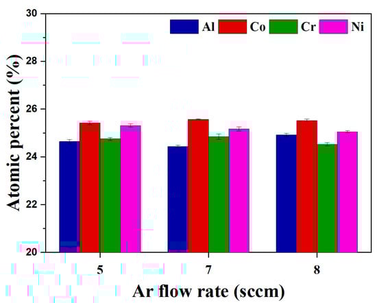 Figure 4 shows the chemical composition of the AlCoCrNi metallic films obtained via FE-SEM energy-dispersive X-ray spectroscopy (EDS). The atomic ratio of each element of Al, Co, Cr, and Ni has a value between 24.4 at.% and 25.6 at.%, showing that the chemical composition of the deposited films is very similar to the target composition, with almost equiatomic percentages at various Ar gas flow rates. The detailed chemical composition of the target materials and thin films is also summarized in Table 3. As all the elements were deposited in a similar ratio to the composition of the target, sufficient energy was applied to obtain different sputtering yields for each component [21,40,41,42].