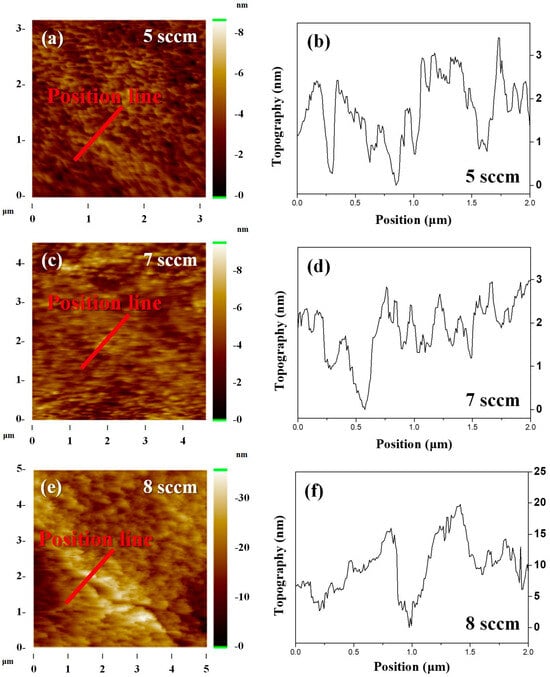 The AFM images and topography of AlCoCrNi HEA metallic films deposited at various Ar gas flow rates of (a,b) 5 sccm, (c,d) 7 sccm, and (e,f) 8 sccm.