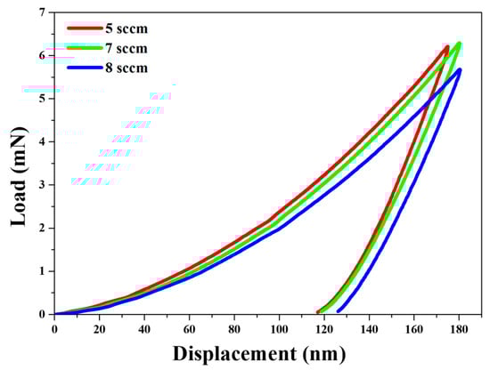 Nanoindentation testing was performed on the topmost surface of AlCoCrNi HEA metallic films to investigate Ar gas flow rate-dependent mechanical properties, such as the hardness (HIT), Vickers hardness (HVIT), and Young’s modulus (EIT) of the thin films. The typical load–displacement curves of the thin films deposited at various Ar gas flow rates are shown in Figure 7, and the detailed mechanical properties are listed in Table 4. The maximum depth of the films is 1/10 of the thickness of each film. At the same maximum depth, the maximum load would be the highest for the specimen with an Ar gas flow rate of 5 sccm and the lowest for the specimen with an Ar gas flow rate of 8 sccm. Similarly, as presented in Table 4, the specimen with the Ar gas flow rate of 5 sccm had the highest Vickers hardness, with a value of about 1137 HV.