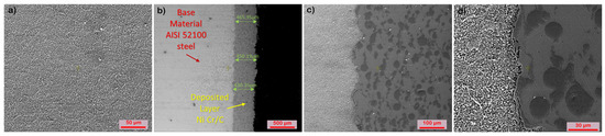 The WIP-C1 powder consisting of Ni and CrC powders was deposited on AISI 52100 steel. An SEM image of the substrate surface is presented in Figure 2a. Cross-sections of the substrate–deposit interface at different magnification levels are presented in Figure 2b–d. Figure 2c,d show that both the particles and the substrate surface were deformed upon multiple particle impacts. This substrate has high hardness which amplifies the degree of deformation of the particles, allowing for successful deposition, resulting in dense and tightly bonded coatings on the substrate surface. Figure 2b shows that the deposited surface is flat and free of cracks, both in the coating material and in the particles within the coating material. The dimensions of the deposited layer are approximately between 430 μm and 465 μm.