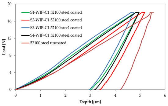The graphs resulting from the microindentation tests show the specific load and the penetration depth; Figure 4 shows comparative graphs for the coated and uncoated samples, with a load of 20 N.