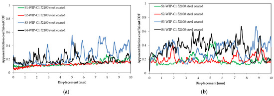 Graphs obtained after the tests to determine the resistance to microscratches: (a) samples for linear load at 10 N; (b) samples for constant load at 10 N.