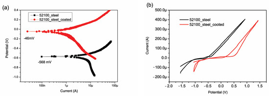 More complete information on the electrochemical processes at the electrodes or in solution can be obtained using the cyclic polarization curve. Cyclic polarization plots are presented in Figure 11b. The anodic curves overlapped with difficulty over the cathodic curves for both samples, as is characteristic of generalized corrosion, but at the same potential the current density for the coated sample was lower than for the uncoated sample. It can be observed that the breakdown potential for the coated sample was around 0.6 V and for the uncoated sample it was around −0.4 V, indicating more electronegativity.