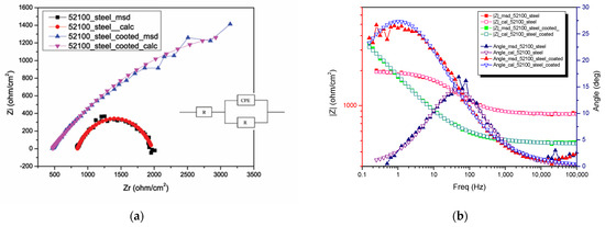 (a) Nyquist and (b) Bode plots for 52100 and 52100 coated steel.