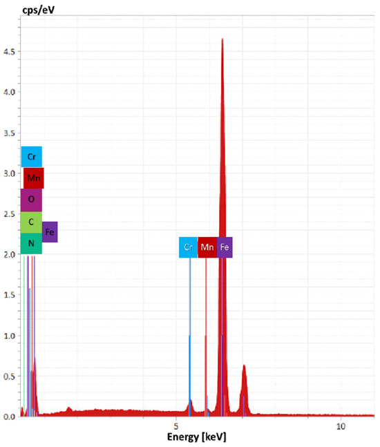 The amount of oxygen is not very high at the surface, which indicates that in this type of electrolyte, reduction reactions are favored. Small mass percentages are shown for both nitrogen and sulfur, based on nitrides and sulfides that are formed during electro-corrosion processes. The energies of the specified elements are given in the spectrum plotted in Figure 14, highlighting two energies for Fe and Mn.