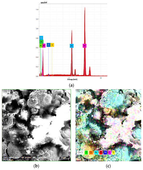 On the surface of the sample, on the micro-scale, few compounds can be observed. By analyzing the chemical composition, in addition to the elements that make up the deposited layer (Cr, Ni, Si, and C), other elements such as nitrogen, oxygen, and sulfur were identified in small quantities, as seen in Figure 17. Unlike the material of the base of the tested sample, it can be appreciated that the deposited superficial layer shows significantly lower oxidation. Table 13 shows the chemical composition of the surface after electrochemical tests.