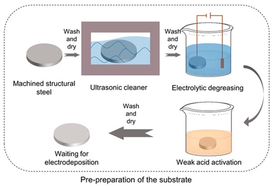 40CrNiMoA structural steel was used as the substrate in this work. The composition of the structural steel is shown in Table 1. The diameter of the substrate was 65 mm, and the substrate surface roughness was machined to Ra 0.8 μm for a better binding strength of the coating. The pre-preparation was conducted before deposition to improve the bonding strength. As shown in Figure 1, the substrate was ultrasonically cleaned in a P-3 solution for 10 min. Then, the substrate was washed in deionized water and dried in a dryer. Subsequently, the steel disk was electrolyzed in sodium hydroxide solution for 5 min, and washed in deionized water. Finally, the substrate was activated in a dilute sulfuric acid solution, washed in deionized water, and dried for the next processing.