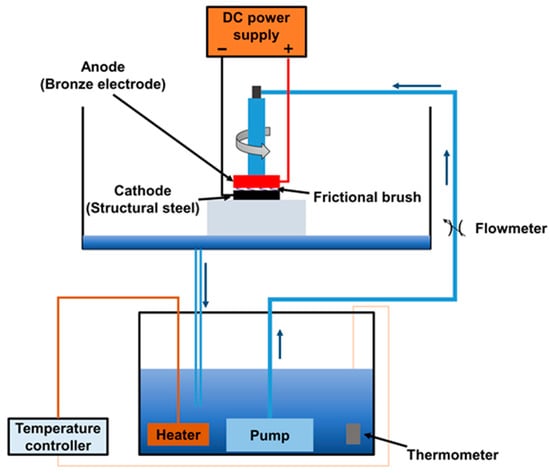 The schematic diagram of FJED is shown in Figure 2. The electrolyte was stored in the solution tank, and heated using a controlled heater. Then, the electrolyte was transported and injected into the cathode surface with a submersible pump (LP-548, Zhejiang Jialu Aquatic Products Co., Ltd., Zhoushan, China). The flow rate was adjusted using a flowmeter. Finally, the electrolyte flowed back into the solution tank. The bronze anode and the 40CrNiMoA cathode were placed face to face with a 1 mm interval between the two electrodes. The anode with frictional brushes was rotated via a motor to rub against the cathode surface.