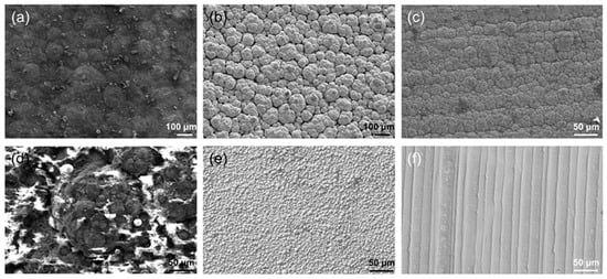 The surface morphologies of the bronze coatings prepared using (a) TED at 1.5 A/dm2, (b) JED at 10 A/dm2, (c) FJED at 10 A/dm2, (d) FJED at 20 A/dm2, (e) FJED at 8 A/dm2, and (f) FJED at 8 A/dm2 with the post-processing of turning.