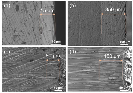 The morphologies of the coating cross-sections are shown in Figure 4. The coating thickness was further determined with the EDS mapping spectrum and line scanning spectra in Figure S1. In Figure 4a, the thickness of the bronze coating prepared with TED for 1 h was merely 15 μm. In Figure 4b–d, the thicknesses of the coating prepared using FJED were 350 μm, 80 μm, and 150 μm, respectively. Some small cracks and pores were detected on the internal side of the TED coating, while the deposition time was 1 h. The cross-sections of coatings prepared using FJED were smooth and compact, which implies that the frictional brushes remove the large grain cells and hydrogen bubbles during processing. The deposition rate of the processing could be approximately calculated according to thickness and deposition time, and the formula is shown in Equation (1):