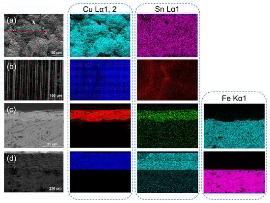 The EDS mapping spectrum of the coating surfaces and cross-sections are shown in Figure 6. In Figure 6a,b, copper and tin were evenly distributed on the bronze coating surfaces. However, some dark areas were shown on the TED coating surface because defects existed in the concaves between grain cells. In addition, the FJED coating showed that the interior of the coating was completely filled with copper and tin. In Figure 6c, the cross-section of the TED coating showed that the interface between the coating and the steel substrate was not smooth. It was believed that the transition layer was formed at the interface. Copper and tin atoms were diffused into the iron lattice, and the iron lattice was distorted. Chen et al. reported that bronze coatings on bare steel surfaces accelerate the formation of infiltrated cracks from the bronze coating to the steel []. However, the interface between the bronze coating and steel substrate was sharp and smooth. There was no copper detected in the steel area, and no iron detected in the bronze area. In the distribution of tin, a part of the faint tin peaks was displayed in the steel area. That did not mean that tin infiltrated to the steel substrate. Due to the low content of tin in the bronze coating, the background peaks in the steel substrate were displayed in the tin mapping spectrum. Thus, infiltrated cracks were eliminated with FJED.