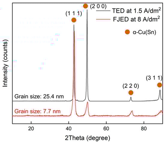 The XRD patterns of the bronze coatings prepared using TED and FJED are shown in Figure 7. The grain structures and grain sizes were characterized to compare the difference between TED and FJED. The iron element of the steel substrate was not detected with XRD because the coating was too thick to be penetrated. The main chemical phase was the α-CuSn solid-solution phase in two coatings []. The crystal planes were (1 1 1), (2 0 0), (2 2 0), and (3 1 1). The 2theta angles of diffraction peals were 42.8°, 49.9°, 73.1°, and 88.7°, respectively. Thus, the main phase was not affected by the different processing or current density. However, the crystal plane (2 0 0) sharply decreased on the FJED coatings. This implied that the main crystal plane was transferred to (1 1 1) on the FJED coatings, and the crystal plane (2 0 0) was suppressed when using FJED processing.