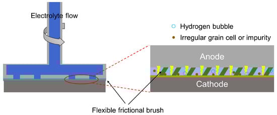 The mechanism of FJED is shown in Figure 8. The electrolyte was injected on the cathode surface through the internal flow channel and anode nozzles. The flexible frictional brushes were driven by the anode to rotate and rub against the cathode surface. When the current density increases, the metal ions in the electrolyte are rapidly consumed, and a small amount of hydrogen ions in the solution will be reduced to hydrogen by the electric field and attach to the cathode surface. In traditional electrodeposition processes, hydrogen bubbles attached to the cathode surface cannot detach and are covered by a new layer, resulting in porosity defects inside or on the surface of the coating. Because the current density of FJED was higher than that of TED, hydrogen bubbles and irregular grain cells were easily formed on the cathode surface. In addition, the impurities were distributed in the electrolyte and contaminated the cathode surface. TED was unable to increase the current density due to the formation of these by-products. During the process of FJED, hydrogen bubbles, irregular grain cells, and impurities were also generated but flexible frictional brushes removed these by-products. Then, these impurities were taken away by the high-speed electrolyte. Compared to JED, the high-speed electrolyte not only replenished metal ions but also took away impurities scraped off by the brushes. Finally, the cathode surface was constantly deposited and refreshed.
