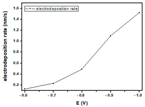 Figure 1 presents the dependence of the electrodeposition rate of the CoPt alloy (expressed as a ratio of the thin film thickness (nm) vs. time) as function of the applied potential. The results clearly show that the electrodeposition rate increases with the increase in the value of the applied potential.