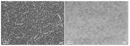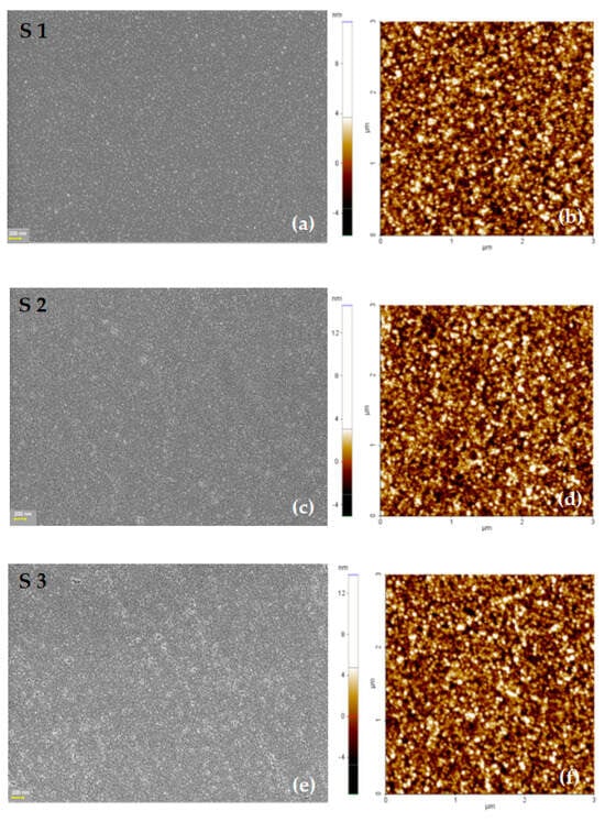 The microstructure of the thin layer surface was analyzed by high-resolution scanning electron microscopy (HR-SEM) (using a CrossBeam System Carl Zeiss NEON40EsB/ Oberkochen, Baden-Württemberg, Germany) and by atomic force microscopy (AFM) (using an AFM XE-100 from Park Systems, Suwon, Republic of Korea). The alloy’s composition was determined by EDX measurements using the same HR-SEM system, while the crystalline structure of the samples was analyzed by X-ray diffraction (XRD) (by means of a Bruker AXS D8-Advance X-ray Diffractometer/Bruker, Karlsruhe, Germany) with parallel optical geometry, using Cu Kα radiation).