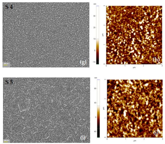 SEM images (left) and AFM images (right) of the CoPt thin films samples prepared at different applied potential/SCE: (a,b) −0.6 V; (c,d) −0.7 V; (e,f) −0.8 V; (g,h) −0.9 V; (i,j) −1.0 V.