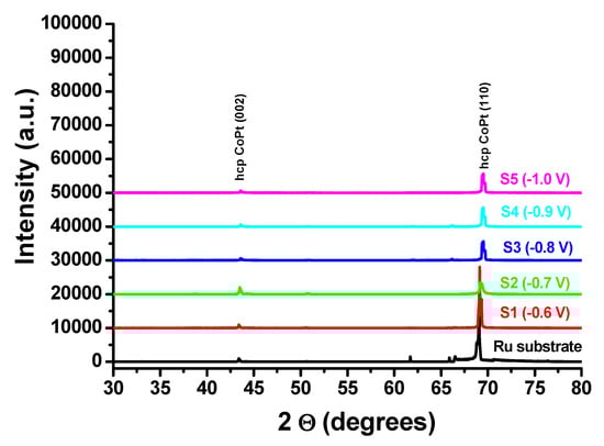 The XRD data (Figure 3) shows that the CoPt electrodeposited thin films have a hexagonal crystalline structure, and the diffraction peaks at 2Θ = 43.6° and 2Θ = 69.5° and can be indexed as (002) and (110) hexagonal structures. Since both the Ru substrate and the electrodeposited CoPt thin layers have a hexagonal structure, there are very small differences on the peak’s positions on the diffractograms.
