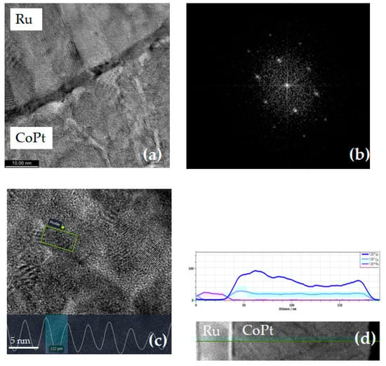 The lattice fringes in processed high-resolution TEM images indicate that the CoPt alloys are crystalline, the crystallites grains following the crystalline orientation of the Ru substrate (Figure 4a,b). Also, the analysis of the high-resolution TEM images (determined for the area from the green rectangle from the image presented in the Figure 4c), reveals that the particles have a lattice d spacing of 2.22 Å, matching the d-spacing in the (110) plane of CoPt with a hexagonal structure, according to the 1524154 cif file in Crystalography Open Database. Furthermore, the electron diffraction pattern (Figure 4c) demonstrates that the crystallites of the CoPt alloys in the shape of thin films are hcp. The EDX analysis carried out by the TEM shows that the electrodeposited alloys contain only Co and Pt, being well separated from the Ru support (Figure 4d). The data of the EDX analysis were acquired along the green line drawn on the image in the Figure 4d.