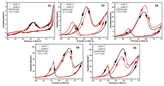 CV curves for MOR on CoPt thin film catalysts prepared from solutions with additives at different electrodeposition potentials: first cycle—black curve and 5th cycle—red curve.