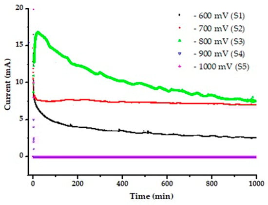 As can be observed in Figure 6, the electrocatalytic activity of samples S1 (electrodeposited at −0.6 V) and S2 (electrodeposited at −0.7 V) rapidly decreases at the beginning of the experiment until the equilibrium value is reached, with the current staying stable until the end of the experiment. The electrocatalytic behavior of sample S4 (electrodeposited at −0.9 V) and of sample S5 (electrodeposited at −1.0 V) is different from those of S1 and S2: it rapidly decreases to 0 mA in the first minutes of the experiments. In contrast with the electrocatalytic behavior of samples S4 and S5, for sample S3, the electrocatalytic efficiency increases for the first 25 min at the beginning of the experiments, after which it decreases slowly, reaching an equilibrium value similar to that of sample S2. The results obtained by CA are in good agreement with those obtained by CV.