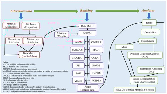 In this investigation, the focus is narrowed down to examining RHEAs as promising candidates for high-temperature, high-strength coatings on hot-forging dies. It is crucial to emphasize that generating data on all the properties (such as wear resistance, strength, fatigue properties, fabricability, coating methods, bonding characteristics, the necessity of a multi-material gradient layer, etc.) for every available RHEA in the current literature is a time-consuming, laborious, and costly endeavor [28]. Moreover, not all the properties mentioned above are documented for every RHEA in the literature; only a few common properties of most RHEAs are reported. Therefore, the overarching approach in this endeavor is to employ decision science to sort and rank the RHEAs based on readily accessible essential properties in the current literature: thermal conductivity and ambient and 800 °C yield strength. Following this strategy, the top-ranked RHEAs, resulting from the decision science-driven ranking, can be subjected to a more thorough evaluation encompassing all other properties pertinent to their intended functional application cost-effectively and expediently. Our approach involves compiling, evaluating, sorting, and selecting RHEAs from the existing literature, focusing on coating hot-forging dies, guided by decision science principles. This process involves integrating twelve multiple attribute decision making (MADM) methods to rank a list of 22 RHEAs. Principal component analysis (PCA), a powerful analytical tool that reduces multidimensional data into a more manageable format, plays a key role in consolidating rankings from various MADM techniques. Furthermore, hierarchical clustering (HC) helps identify similarities among the RHEAs and suggests potential alternatives that could potentially replace the top-ranked choices.