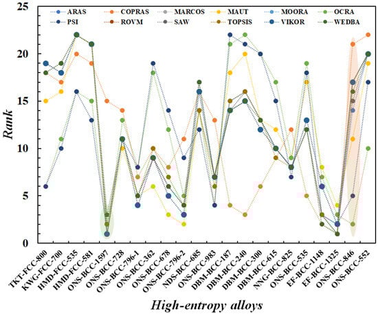 Figure 2 provides a visual representation of the rankings assigned to RHEA-based coatings for hot-forging dies. These rankings are discrete in nature, and for enhanced visual clarity, thin dotted lines connect the points assessed by each of the different MADM methods. Despite the unique mathematical aggregation procedures employed in these various MADM methods, there are instances where the peaks and troughs in the rankings somewhat align. For instance, several MADM methods assign similar ranks to ONS-BCC-1597, as indicated by the green shading. However, it is important to note that the rank assigned by different MADM methods to most RHEAs varies significantly, as seen with the RHEAs designated as ONS-BCC-846 (orange shading).