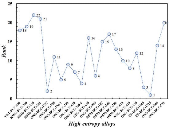 Table 3 presents the Spearman rank correlation coefficient (Sρ) that quantifies the rank correlations among the twelve MADM methods. For example, Sρ values exceeding 0.90, such as those between MARCOS and ARAS, MOORA and MAUT, or WEDBA and ROVM, indicate strong correlations. Conversely, Sρ values below 0.5, as observed between OCRA and COPRAS or VIKOR and PSI, are expected due to the distinct mathematical aggregation approaches in these various MADM methods. Out of the 66 possible combinations of MADM pairs, approximately 54% exhibit rank correlations equal to or above 0.90, while around 72% have rank correlations exceeding 0.55. These findings underscore the robustness and validity of the RHEA rankings. Given the diversity in the correlations across various MADM methods, it becomes imperative to consolidate these rankings. Based on the Sρ values obtained from various combinations of MADM methods, consolidating the rankings from all twelve MADM evaluations is a practical approach. Consequently, the consolidated rank, based on the arithmetic mean, is presented in Figure 3. Notably, the top five ranked data points in Figure 3 are EF-BCC-1325, ONS-BCC-1597, EF-BCC-1148, ONS-BCC-796-2, and ONS-BCC-796-1, listed in that order.