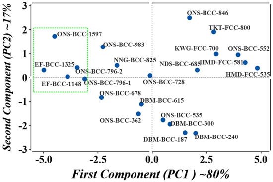 Figure 4 illustrates a score plot showcasing the consolidated rankings of RHEA coatings for hot-forging dies using principal component analysis (PCA). This plot represents the first two components, denoted as PC1 and PC2, derived after reducing the dimensionality of the data, which originally consisted of rankings from twelve different MADM methods. Table 4 provides insight into the eigenvalues and their respective proportions, which capture the distribution of variation within each principal component. Notably, the first principal component, PC1, accounts for approximately 80% of the variation or scatter present in the original data, while the second principal component, PC2, explains approximately 17% of the variation. Given that PC1 captures nearly 80% of the variance initially present across twelve dimensions (sets of ranks), it effectively approximates the overall ranking of RHEA coatings. In the score plot, an imaginary reference line perpendicular to PC1 extends from left to right, ranging from −5 to 5. This line serves as an indicator of the overall rankings of the RHEAs. The top five data points, corresponding to the RHEAs EF-BCC-1325, ONS-BCC-1597, EF-BCC-1148, ONS-BCC-796-2, and ONS-BCC-796-1 (enclosed within the box in Figure 4), are consistently ranked as the highest by PCA-based consolidation and align with the mean-based consolidation of ranking. This alignment with the top-ranked RHEAs determined through mean-based consolidation underscores the consistency and reliability of the ranking results.