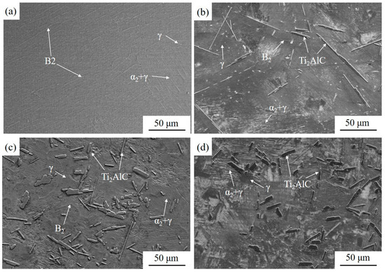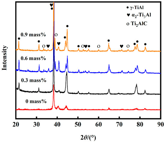 Figure 1 shows the XRD patterns of Ti-45Al-8Nb-xC alloys with different graphite powder additions. The Ti-45Al-8Nb alloy mainly consisted of the α2-Ti3Al phase and γ-TiAl phase. The intensity of the γ-phase diffraction peaks is enhanced with the addition of graphite powder. The diffraction peaks of the Ti2AlC phase appeared at 2θ = 33°, 39°, and 61° when the graphite addition was 0.6 mass% [26]. The highest Ti2AlC phase diffraction peak intensity was observed when the graphite powder addition increased to 0.9 mass%. This indicates that the increase in C content leads to an increase in the volume fraction of the γ phase and Ti2AlC phase. The B2 phase diffraction peaks were not observed in the XRD results due to the limited amount of B2 phase in the alloys that could not be detected using an X-ray. It has been shown that Nb has high solid solubility in TiAl [27]. In the Ti-45Al-8Nb alloy, Nb is mainly solid-solved in the α2 and γ phases, with a small amount of segregation in the B2 phase.