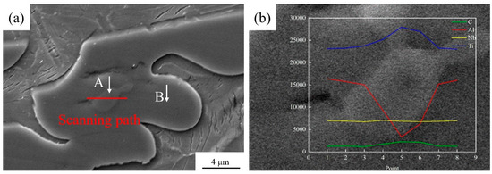 Figure 3 shows the SEM micrographs of Ti-45Al-8Nb alloy with 0.6 mass% graphite powder addition through EDS points and line inspections. Table 1 shows the EDS results for points A and B in Figure 3a. The EDS point analysis reveals that the precipitated phase (B) contains approximately 21.2% C, 46.6% Ti, 26.6% Al, and 5.6% Nb, which is the value of the Ti2AlC phase. Similarly, the atomic ratio of Ti, Al and C in white particle A is close to 1:0:1. Combined with the results of the line scan in Figure 3b, it is found that the content of elemental C in the vicinity of the white particles is elevated, while the content of elemental Al decreases; therefore, it is inferred that the white particles are part of the TiC phase. It has been shown [28] that in the cast Ti-Al-C system, the formation process of the Ti2AlC phase is as follows: When the temperature is higher than 600 °C, Al melts and reacts with Ti to generate liquid TiAl3. As the temperature reaches 900 °C, Ti reacts with C to form TiC. When the temperature rises to 1200 °C, TiC, Ti, and liquid TiAl3 react to precipitate the Ti2AlC phase. With a further increase in temperature, the Ti2AlC phase decomposes into TiC and liquid TiAl at 1625 °C. Meanwhile, TiC is a solid form distributed in the molten metal due to its high melting point (approximately 3200 °C). During solidification, TiC reacts again with liquid TiAl to form the Ti2AlC phase. Therefore, it can be indicated that the white particles are the products of the incomplete reactions between TiC and liquid TiAl.