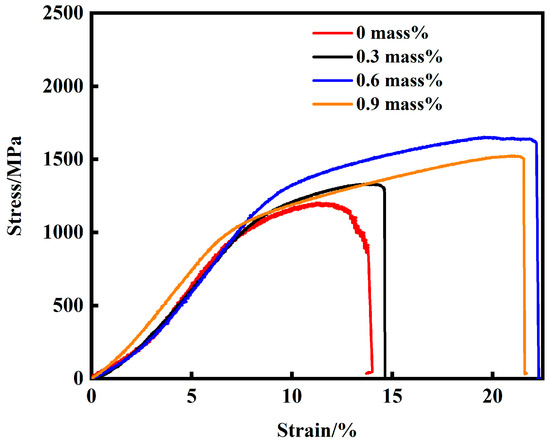 The compression test results of Ti-45Al-8Nb alloys with different graphite powder contents at room temperature are shown in Figure 7 and Table 4. As shown in Figure 7, the nominal yield strength, compressive strength, and strain of the alloy increase with the addition of graphite powder. When the graphite powder addition increased to 0.6 mass%, the compressive strength and strain of the alloy reached the maximum values of 1652 MPa and 22.2%, respectively. Compared with the Ti-45Al-8Nb alloy without graphite powder, the compressive strength is increased by approximately 37.7% and the compression strain is increased by approximately 62.1%. However, when the graphite powder content was further increased to 0.9 mass%, the compressive strength and strain decreased to 1524 MPa and 21.5%, respectively.