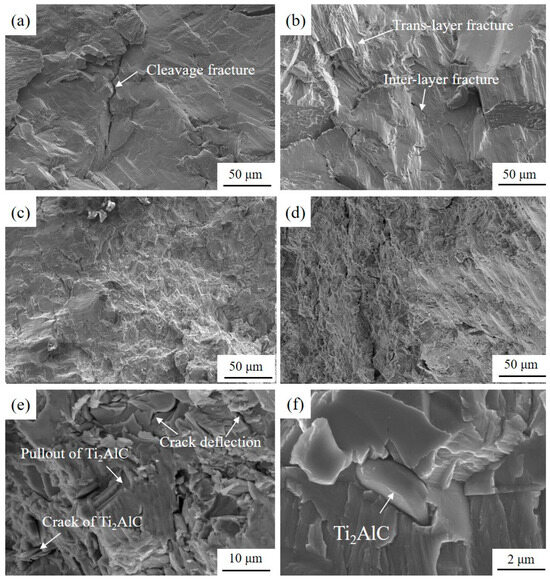 Figure 8 shows the fracture morphologies of the Ti-45Al-8Nb-xC alloy after compression testing at room temperature. The morphology of the fracture contains a trans-lamellar fracture and an interlamellar fracture, which is a brittle fracture. The alloy shows many smooth cleavage surfaces when the graphite powder content is 0 mass%. With the addition of graphite powder, the cleavage surface of the alloy decreases and there are steps. This indicates that the cracks are deflected several times inside the alloy. Figure 8e,f show the magnification of the fracture morphology of the alloys with graphite powder contents of 0.6 and 0.9 mass%. The fracture and shedding of the Ti2AlC phase can be observed. This shows that the strengthening and toughening mechanism of the Ti2AlC phase during deformation is to generate pull-out, interlayer tearing, and debonding.
