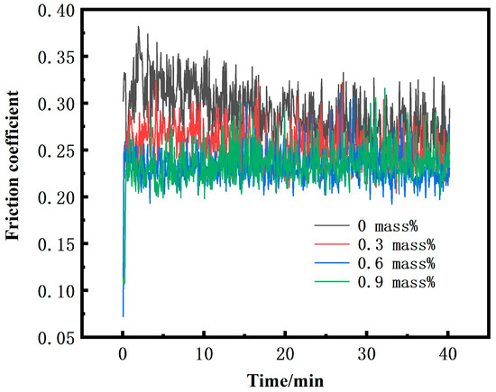 Friction coefficient time curve of Ti-45Al-8Nb alloys with different graphite powder contents.