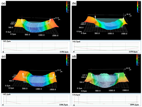 Wear profile of Ti-45Al-8Nb alloy with different graphite powder contents. (a) A total of 0 mass%; (b) 0.3 mass%; (c) 0.6 mass%; and (d) 0.9 mass%.