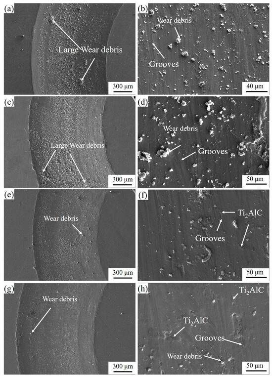 SEM images of the wear-track surfaces of Ti-45Al-8Nb alloys with different graphite powder additions are shown in Figure 11. Wear debris and grooves are observed on the wear surfaces of all alloys. This shows that the main wear mechanism of the alloy at room temperature is plowing wear. The reason for the formation of grooves is that the hardness of the Si3N4 balls (15 GPa) [32] is higher than that of the TiAl specimen (5.9 GPa) and the Si3N4 balls can press into the sample and plow the surface under the normal load. The composition of the debris on the wear surface is identified through EDS. The results show that the compositions of the bulk debris are mainly TiAl and Si3N4 (in Figure 11b). As shown in Figure 11a,c,e,g, the worn debris on the wear surface of the sample gradually decreases with increasing graphite powder content. However, the abrasive particles remaining in the wear track will further wear the sample surface, leading to an increase in the coefficient of friction [33]; therefore, the alloy with graphite powder added exhibits a lower coefficient of friction. The convex Ti2AlC phase was observed on the wear surface of the samples with high content graphite powder (0.6 and 0.9 mass%) and some grooves were separated at the Ti2AlC phase. Since the hardness of Ti2AlC (11.4 GPa) [34] phase is higher than that of the Ti-45Al-8Nb alloy matrix, a large number of convex Ti2AlC phases on the surface of the alloy can hinder the direct contact between the Si3N4 balls and the alloy, thus reducing the plowing of the alloy by the Si3N4 balls. Therefore, the worn debris on the surface of the wear track gradually decreases with the addition of graphite powder and the wear rate shows a gradually decreasing trend.