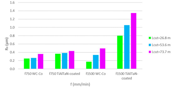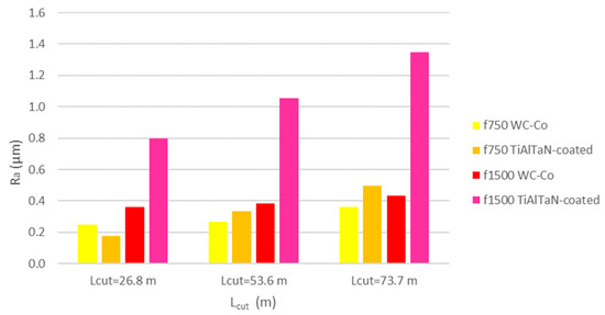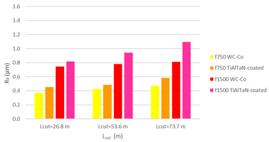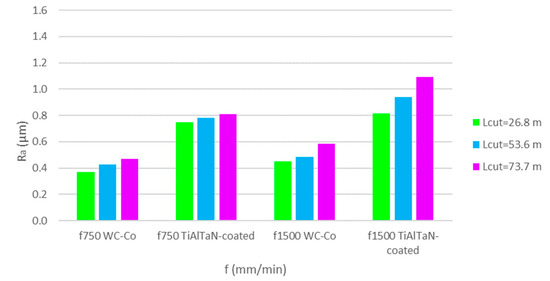 - In WC-Co uncoated tools, there was an evident influence of f and Lcut parameters on the Ra values. Regarding Ra values, the lowest values were observed for the test conditions of f = 750 mm/min and Lcut = 26.8 m (tool ref. T0L27F750S126), while the highest Ra values were for f = 1500 mm/min and Lcut = 73.7 m (tool ref. T0L74F1500S126), both in the longitudinal and transverse directions.