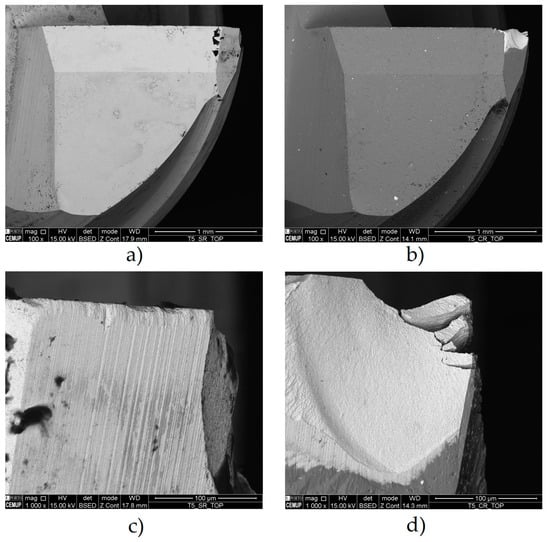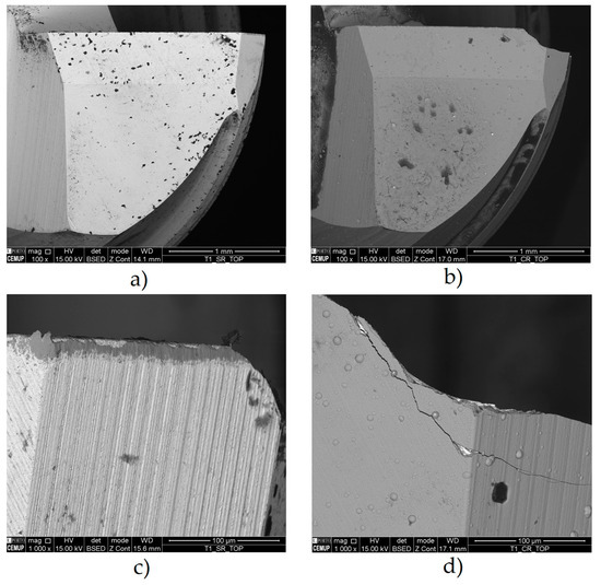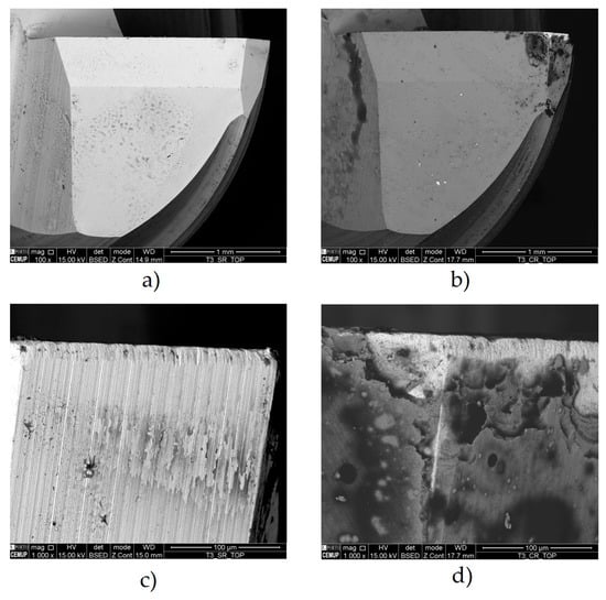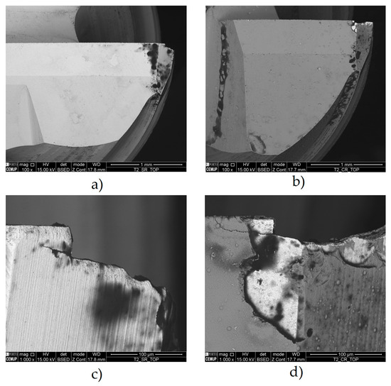 - The maximum SR values are higher for higher f and longer Lcut. Additionally, in the case of coated tools, this value is more significant than in uncoated ones. The VB values for f = 750 mm/min and Lcut of 26.8 m and 53.6 m for the uncoated tools (tools ref. T0L27F750S126 and T0L54F750S126) were entirely satisfactory. Whereas in the other conditions, values ranging between approximately 60 μm and 150 μm were observed, these tools did not exceed 15 μm of VB, which is highly acceptable for VB.